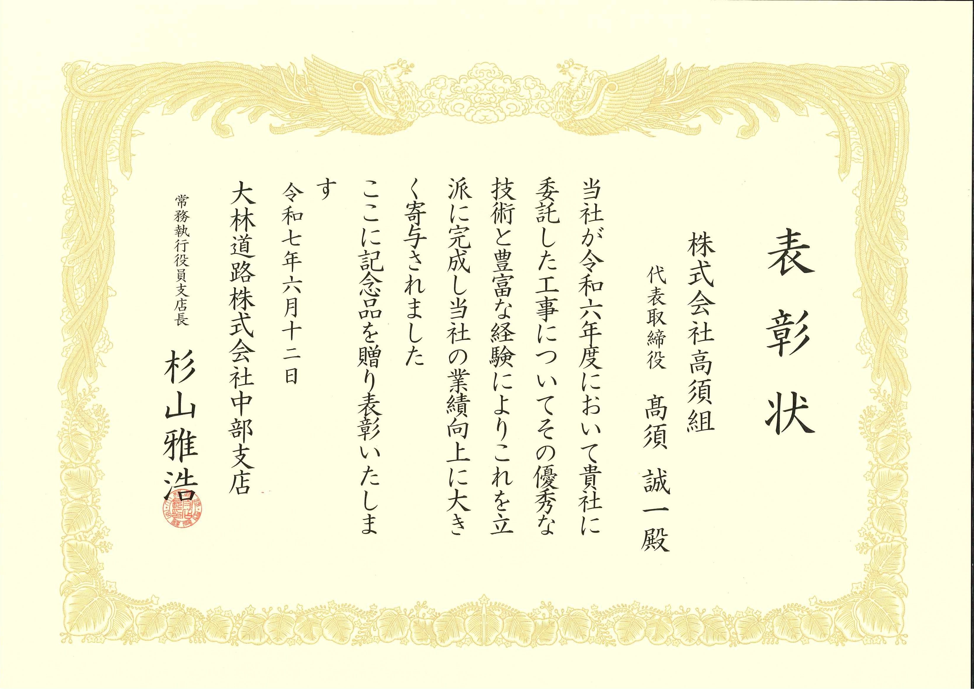 大林道路株式会社中部支店様より表彰されました。